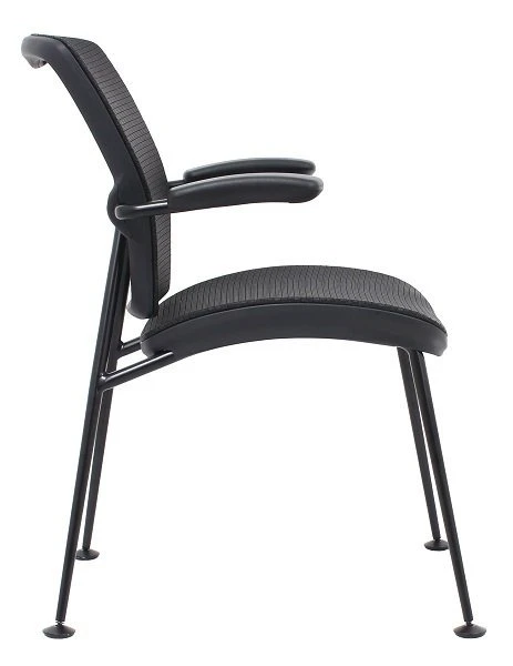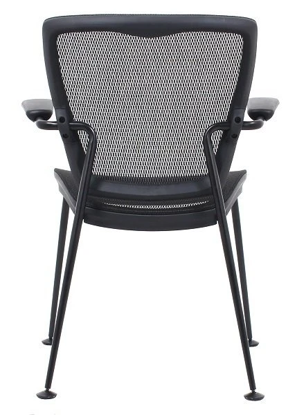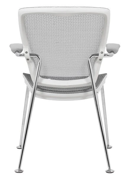 Guest chair with 4 legs. Articulated lumbar support which automatically adjust to posture. Elegant look to add to your office. Available all black or white frame, silver mesh and chrome base.