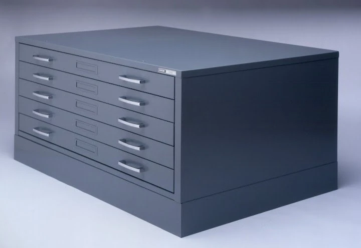 5 drawers. Self-contained steel file plan with integral cap. 2 units can stacked and bolted together. Drawers have front metal plan depressor and rear hood to keep documents flat and orderly.