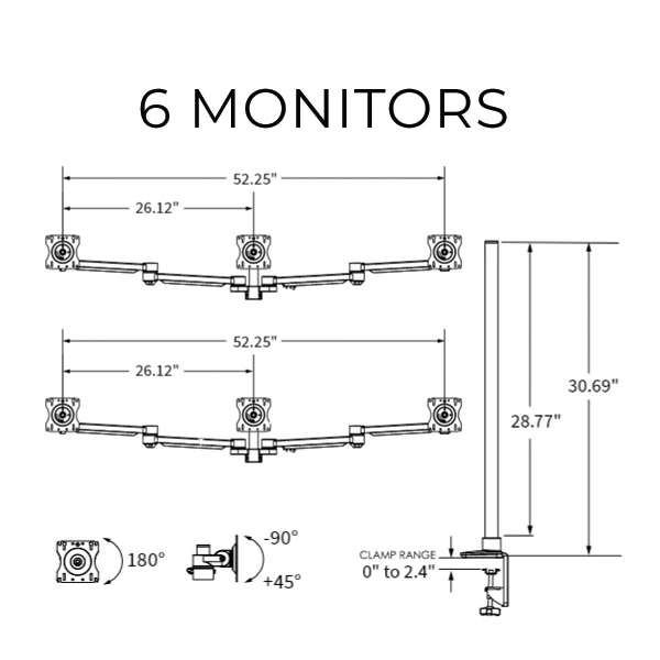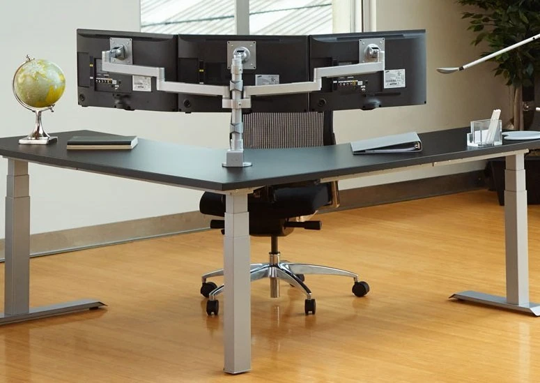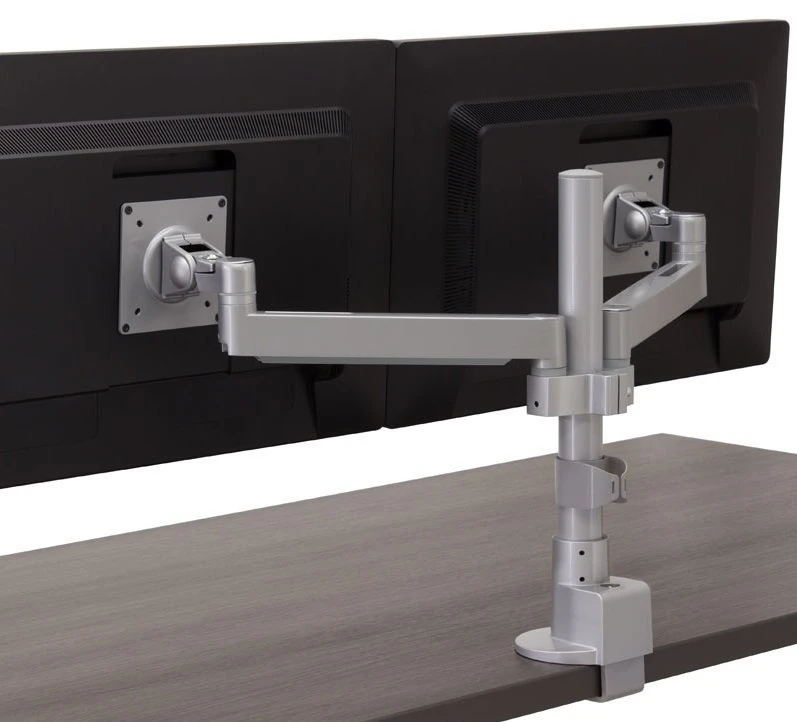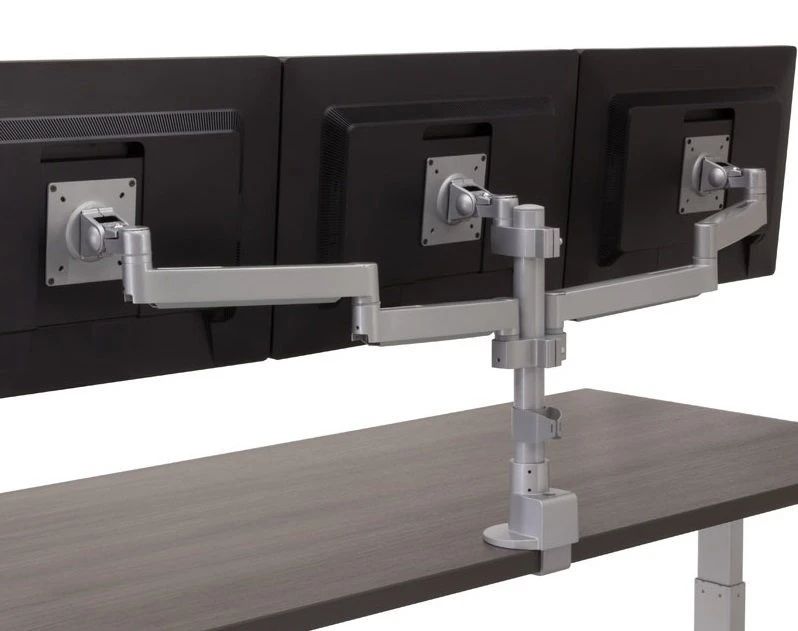 Workrite Conform static monitor arm with lateral movement only. May hold up to 6 computers: 3 computer monitors side by side and on 2 rows. Very useful to free a desk when many monitors are required on a workstation. Ergonomic work for computer intensive office workers.