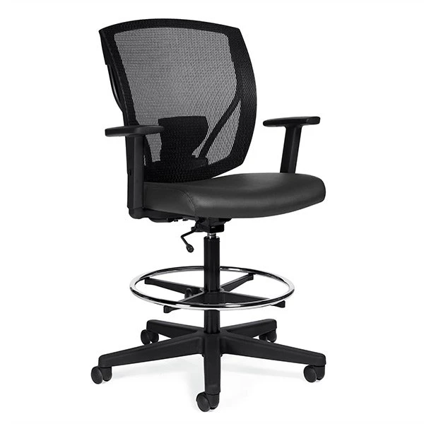 Global Ibex drafting chair or stool with mesh back and footring. Breathable mesh back and comfortable padded seat. The Ibex drafting stool perfect blend of high performance and visually stunning chair design. Height adjustable T-arms. Ibex drafting chair by Global.
