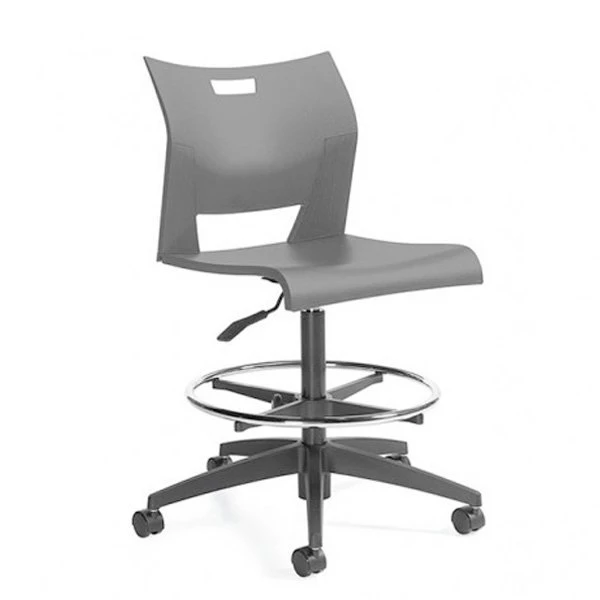 Drafting stool task chair made with durable polypropylene seat & back. Pneumatic seat height adjustment on 10”. Round height adjustable footring for more comfort. This product is available with or without armrests.