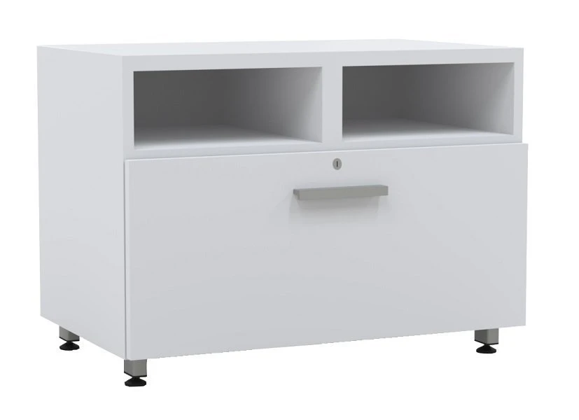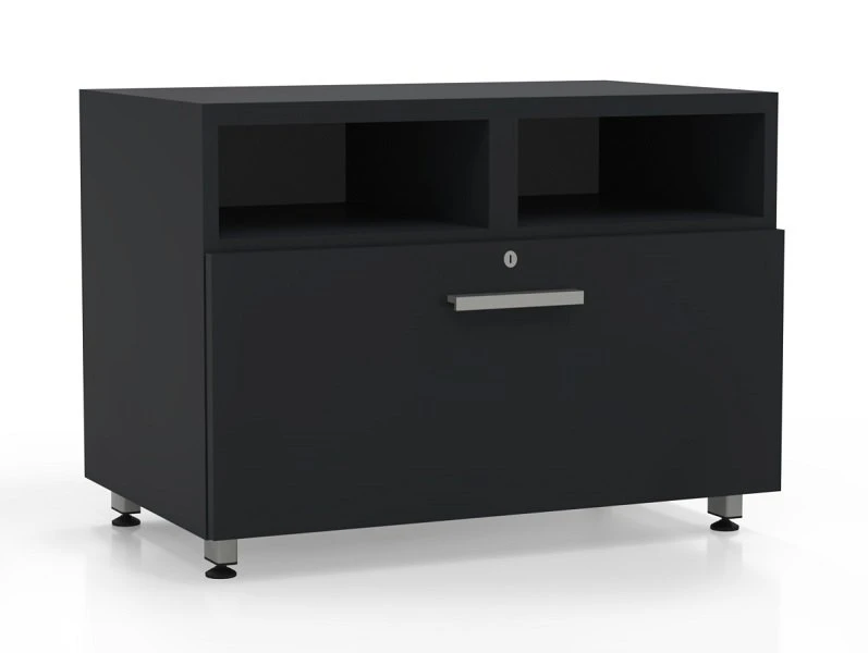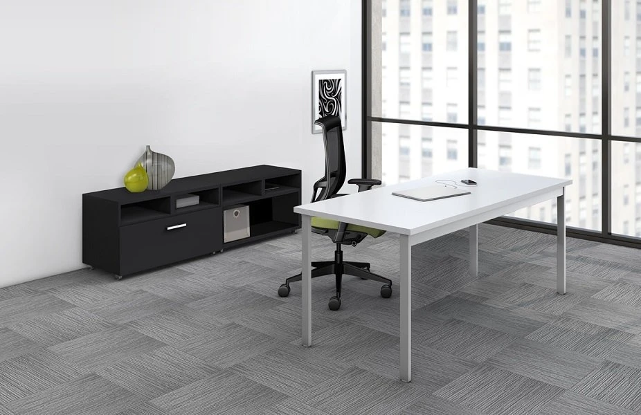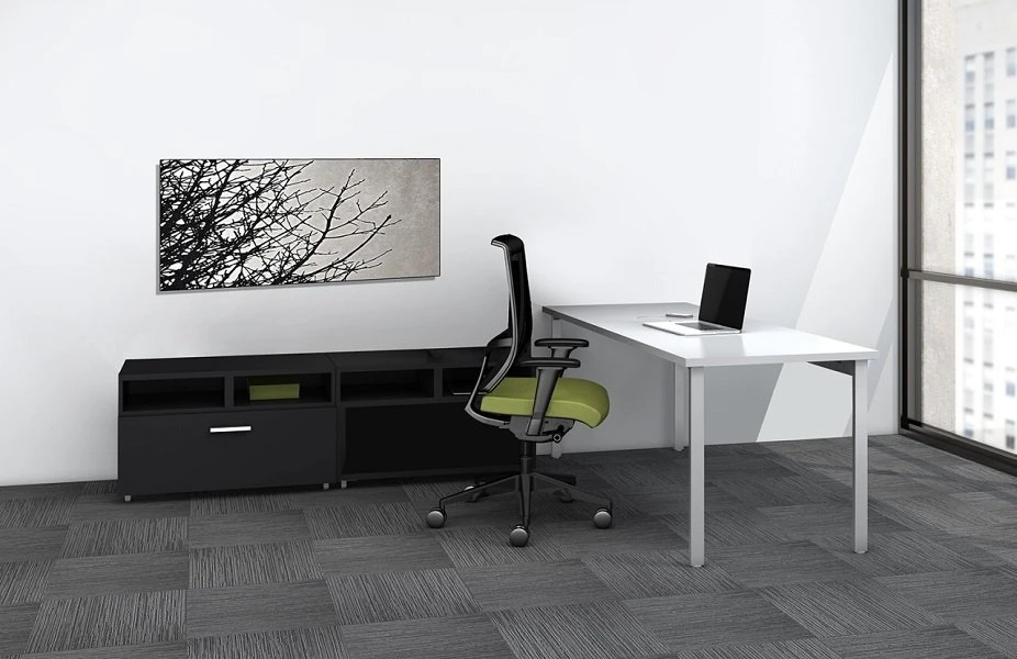 e5 office desk collection by Mayline. Economical desk choice for home office and commercial office. Furniture can be configured in 3 different layout. The desk can overlap the storage or be completely aside the storage. The desk is offered in Designer White with Silver legs. The cabinet and lateral file are available in White or Raven (dark grey).