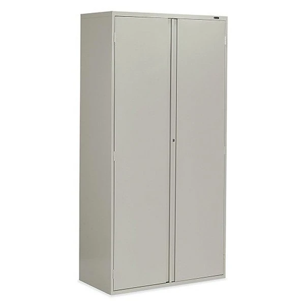 Two door hinged metal storage cabinet. 72inches high. with one fixed and three adjustable shelves. Full pull handles. Bottom pan can also be used as a shelf. Levelling glides are standard. Lock included.