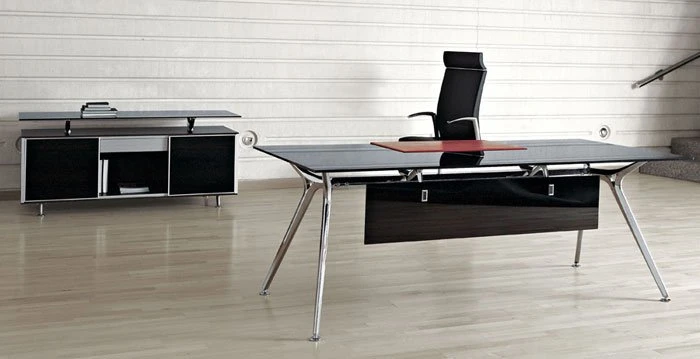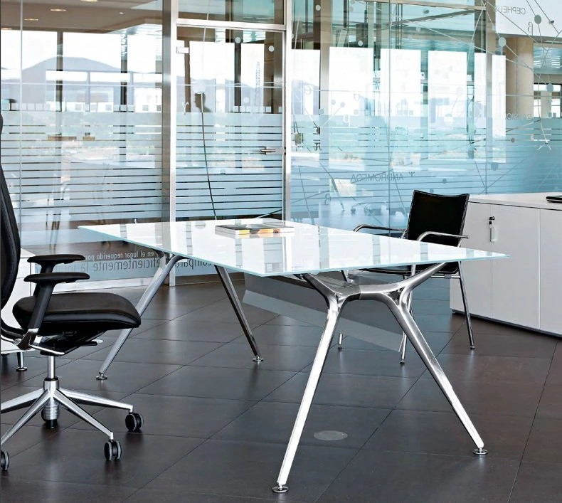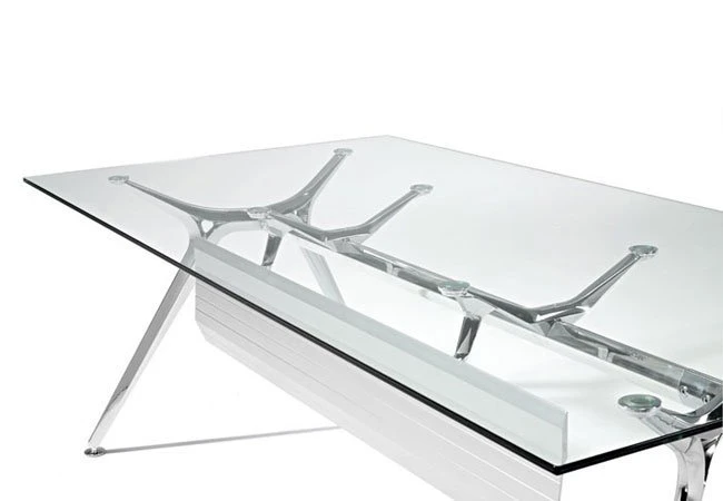 Arkitek’s glass design furniture by Tusch. Executive table with a tempered glass top. Bring elegance and avant-garde design to your modern office. Its sophisticated base structure is made entirely of polished aluminum. Creative mix of quality materials and natural elements. Create a Wow effect at first sight!