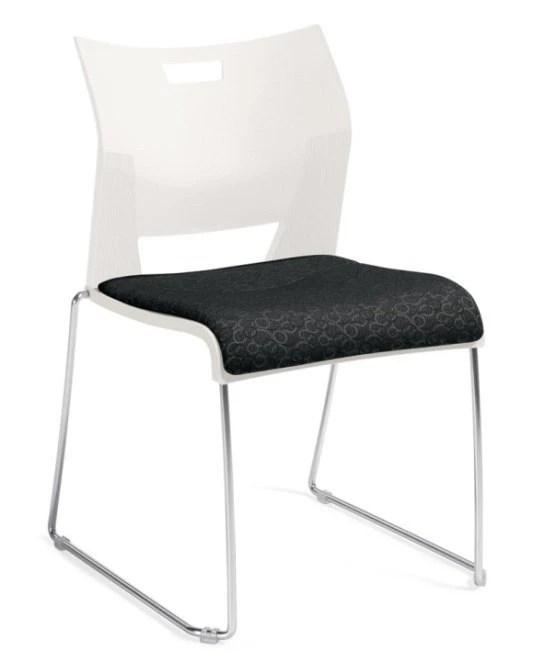 Global Duet cafeteria or guest office stacking chair. Upholstered seat for additional comfort. Stacking office chair made with durable high density polypropylene. Optional armrests. Frame in chrome only. 10 polypropylene and 12 fabric colors to choose from.
