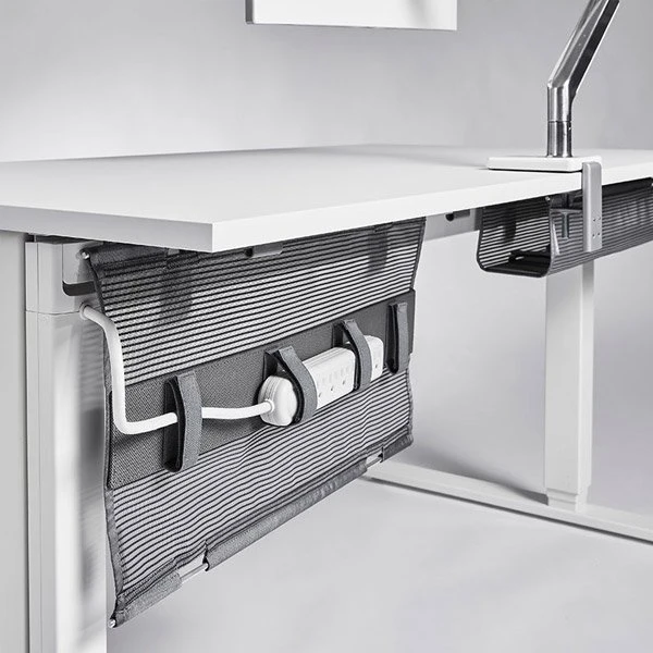 The NeatTech cable management support by Humanscale is an easy-to-install wire net that easily attaches to any desk for reducing desktop’s overall clutter. It stores power strips and cables neatly and safely off the floor to protect technology and is offering a clean, free workspace. NeatTech features unique hook and loop ties to secure cables and offers easy access once installed.