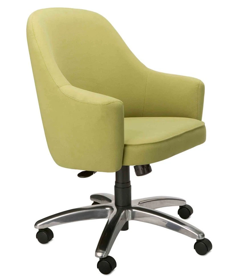 Medium back executive office seating SODA 1700 by Nightingale. Swivel-tilt mechanism. Tension-tilt control. Pneumatic height adjustment. 5 star polished aluminium base. Fully and fixed upholstered arms with open back.
