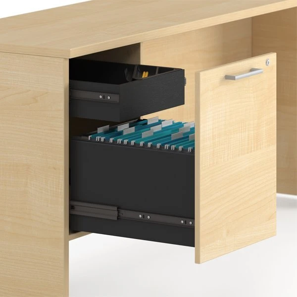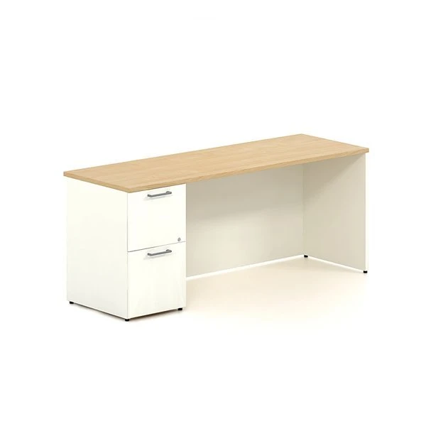 3. CREDENZA: 20″ depth x 72″ width. Raised modesty panel. Pedestal with full height front concealing 1 box drawer and 1 file drawer. Suspension bars, lock and pencil tray included.