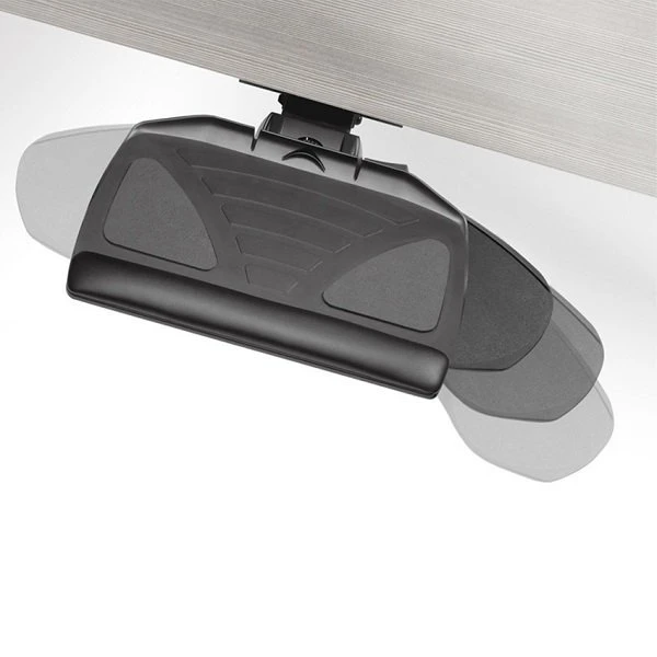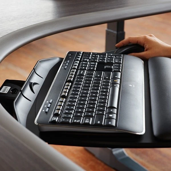 Banana keyboard platform by Workrite that can be use with a straight or a corner desk. Mousing platform can accomodate left or right handed user. Featuring a built-in document holder.