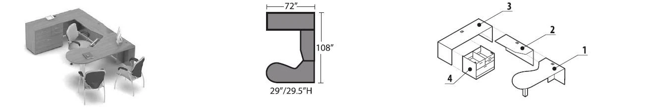 1. EXTENDED COMPUTER CORNER “P” ISLAND 36″ depth x 72″ width. Connect to a 16″ depth space saver return. Grommet. 4″ corner silver post.